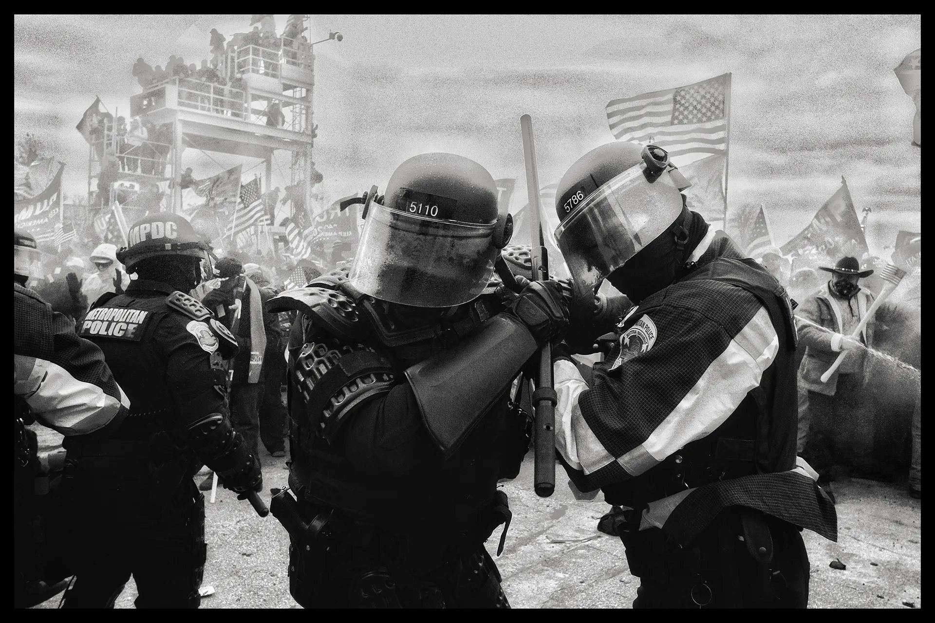 "...it feels like there’s no sense of where people are going. No idea where the chambers are. I have no idea- it’s my first time in here, like it is for most of the insurectionists too. And then they’re moving through the hallways, and the front group stops. I walk into the scene and there’s one police officer, standing there, shouting at them. He’s telling them to stop, they’re telling him to move, they move towards him and he grabs at his pistol. I see him unclip the holster for his weapon and I make sure there’s a protester between me and him - ten inches of flesh should be enough to stop a 9mm I figure and keep working.But incredibly this officer–an African American man being confronted by scores of white nationalists, one of them actually carrying a Confederate flag, others in helmets and armor, some of them with spears and bats–shows restraint. He threatens and he shouts, and he points and screams and holds his ground, and talks into a small radio on his shirt. And then he runs up the stairs. The group follows, and they round the stairs, and follow him into a room with more officers…His name, I would later learn, was Eugene Goodman. He acted as a diversion to draw rioters away from the Senate chamber. There weren't many moments that we can be proud of as a nation from Jan. 6, 2021, but this is one of them." –Ashley Gilbertson