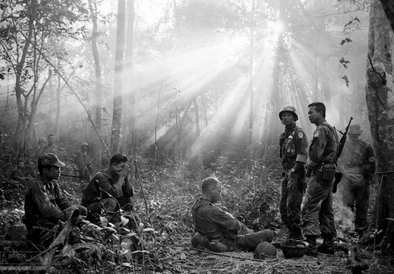 Vietnamese troops, joined by U.S. personnel, rest after a cold, damp