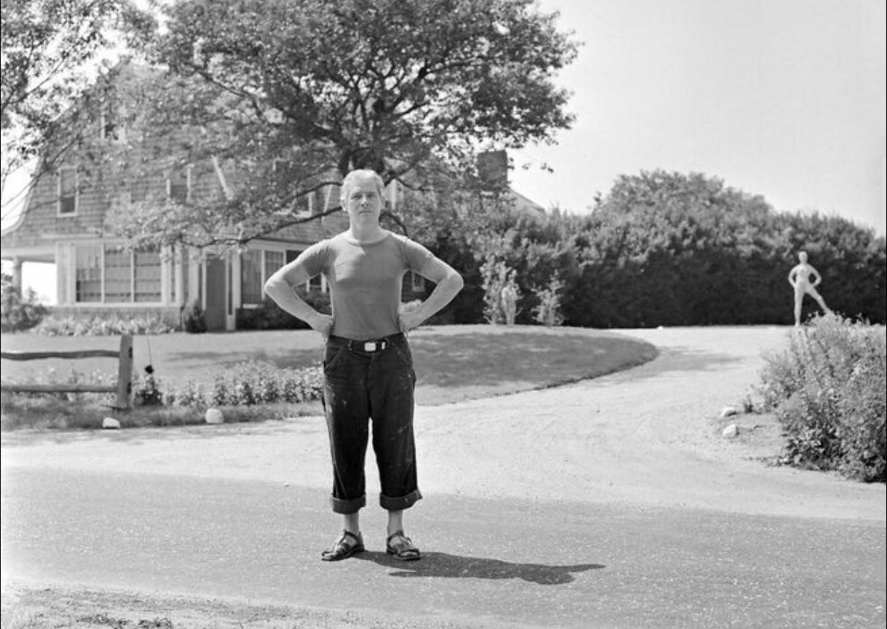 Willem de Kooning, standing in front of Leo Castelli's house, protecting a statue that Castelli himself had made in his driveway. Jackson Pollock disliked it and had threatened to run it over. East Hampton, 1953. By Tony Vaccaro.
