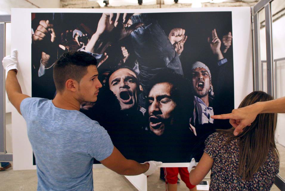 Employees fix a photograph by Italian Alex Majoli prior to the opening of the exhibition devoted to the work of the World Press awarded photographers as part of the International Photojournalism Festival of Perpignan "Visa pour l'image" on August 31, 2012 in Perpignan, southern France. Majoli won the first prize in the general news singles category for this photograph featuring protesters in Tahrir square reacting to a speech by the former Egyptian president Hosni Mubarak. The festival takes place from September 1 to 16. AFP PHOTO PHOTO / RAYMOND ROI Via artdaily.org