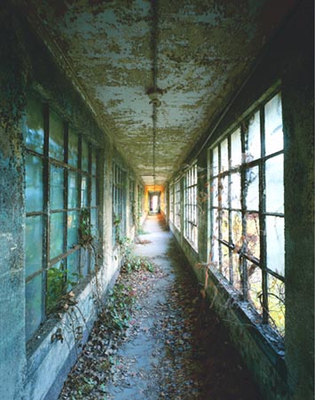 The hospitals were closed in 1954 and basically left untouched, except by the elements of nature, and unseen, until Wilkes came along. Empty rooms, peeling paint, a lonely shoe left on a table — this deterioration is what Wilkes finds beautiful. His meditative studies of light and composition guide the viewer through Ellis Island's dark side, oddly illuminated by an afternoon glow.
