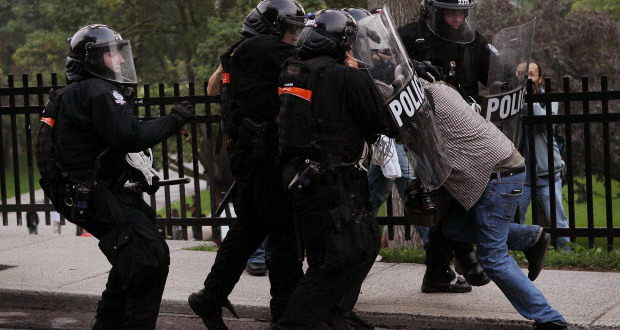 Police officers tackle and detain a National Post photographer while he was photographing protesters demonstrating against the G8/G20 summits June 26, 2010 in Toronto, Canada. Photo: Scott Olson/Getty Images