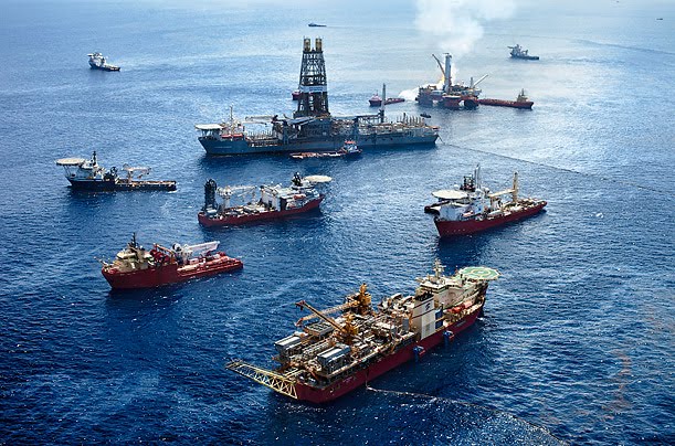 The platform (right rear, with flame) is supported by numerous craft, including: the Discoverer Enterprise (center with the tall tower), which was the first ship to collect oil from a cap placed over the well; the Helix Producer (lower right with green helicopter landing pad), another containment ship that is on hold while the well remains capped; and a small flotilla of ships that operate the remote operated vehicles, the underwater robots that carry out procedures on the wellhead.