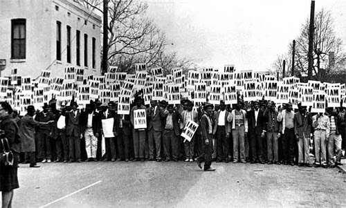 Sanitation Workers assemble in front of Clayborn Temple for a solidarity march, Memphis, TN, March 28, 1968
