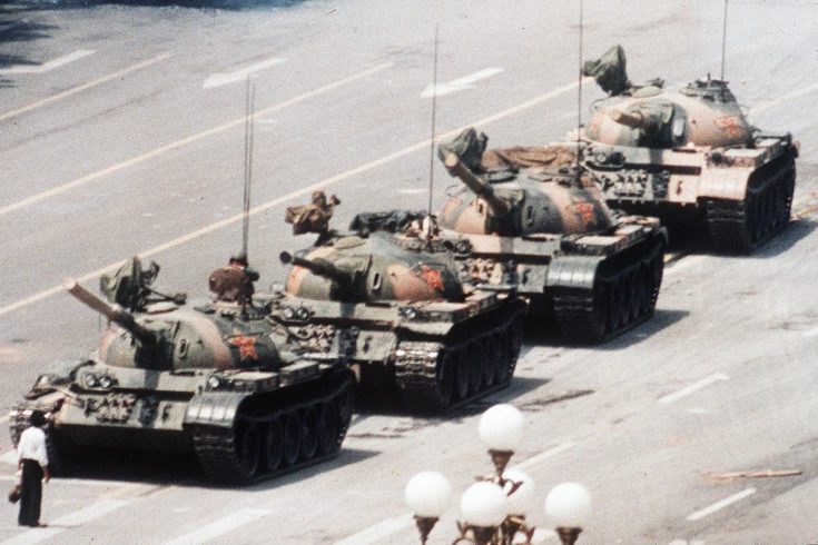 A Chinese man stands alone to block a line of tanks heading east on Beijing's Changan Avenue in Tiananmen Square on June 5, 1989. The man, calling for an end to the recent violence and bloodshed against pro-democracy demonstrators, was pulled away by bystanders, and the tanks continued on their way.